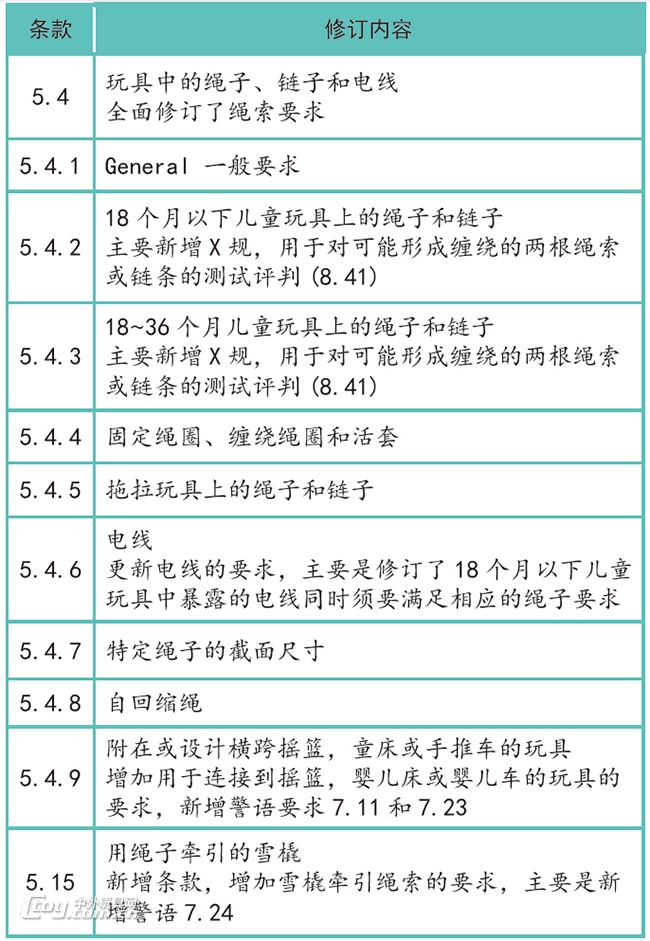 此次2018版,全面修订了玩具中的“绳索”的条款。关于绳子、链子和电线等主要修订内容见下表:
