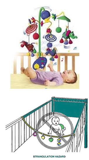设计横跨摇篮、童床或手推车的玩具,其包装和玩具上须有警告: “Warning. To prevent possible injury by entanglement, remove this toy when the child starts trying to get up on its hands and knees in a crawling position.”(“警告。为了防止可能的缠绕伤害,当小孩开始尝试通过膝盖和跪着的方式自己站立起来的时候,请移除这个玩具。”)